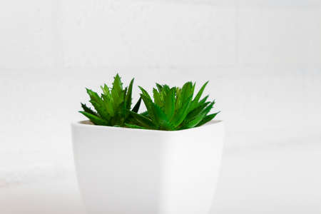 Artificial green succulents in white plastic pot. Close-up. Mock-up. Fake plant.