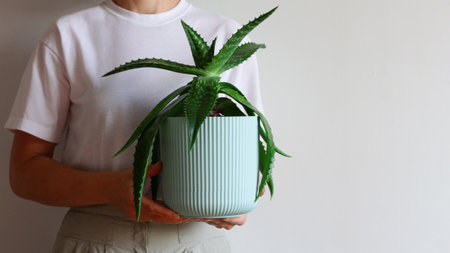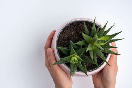 Womens hands carefully hold a Haworthia flower in a pink pot on a white background