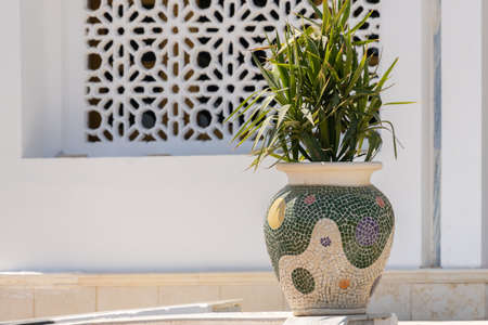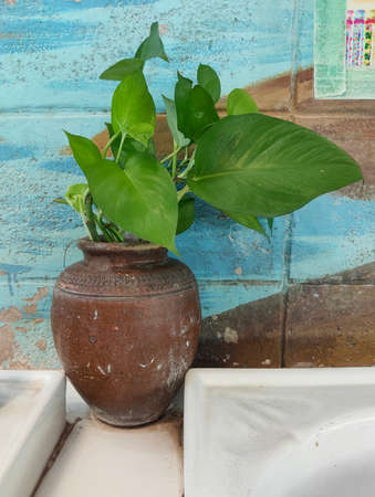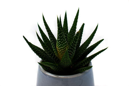 Succulent aloe vera dark green plant in an old brown pot on the white wall background