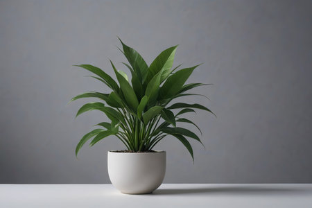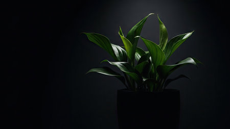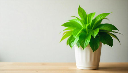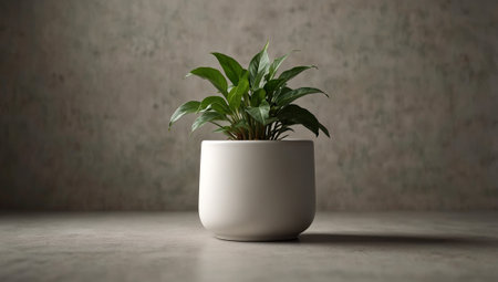A vibrant green plant with layered leaves sits in a simple white pot, bathed in gentle light creating a serene atmosphere.