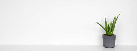 Aloe vera plant in a dark cement pot. Side view on white shelf against a white wall. Banner with copy space.