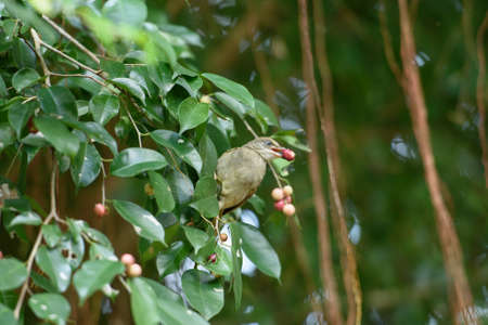 Close up of a Bulbul bird (Pycnonotus goiavier) feeding on fruits