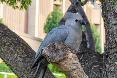A Western Grey Plantain-Eater (Crinifer piscator) standing on a large branch
