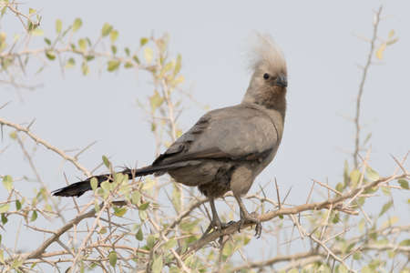 A grey lourie -Corythaixoides concolor- or Grey Go-away-bird sitting in a tree near Twyfelfontein, Namibia.