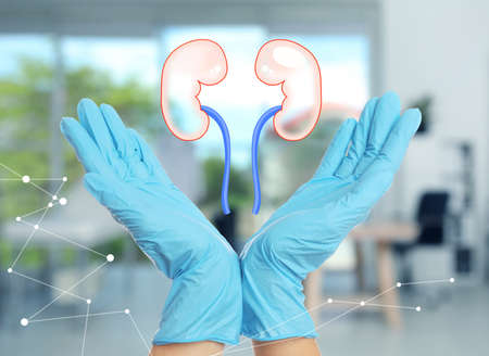 Close up view of doctor indoors and illustration of kidneys