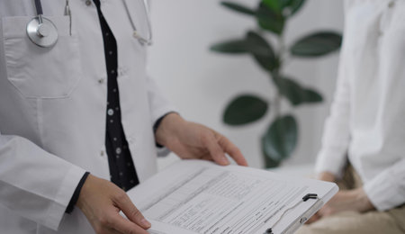 Female doctors who treat patients make an appointment to listen to the results after a physical examination and explain medical information and diagnose the disease. Medical concepts and good health.