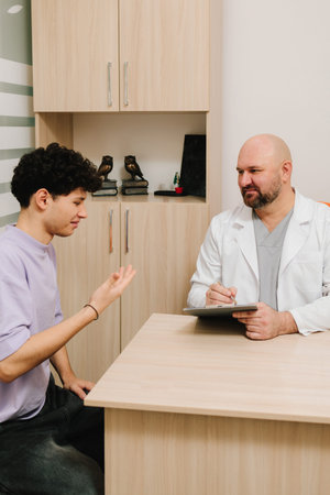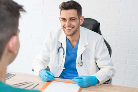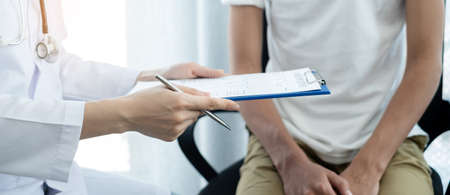 Young man consulting with doctor about causes of erectile dysfunction in examination room with doctor about prostate cancer and urinary tract infection. Close up.