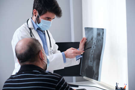 Young doctor examining x-ray of a senior patient backbone. Radiography of a spine, spinal or vertebral column.