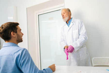 View from back of sitting male patient to mature adult urologist putting pink protective gloves in hands before examining client. Doctor wearing protective glove for rectal examination of man.