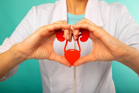 Female doctor with a stethoscope is holding mockup human urinary system . Help and care concept