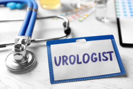 Badge with inscription UROLOGIST and stethoscope on table