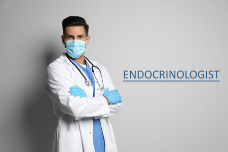 Endocrinologist in protective mask and medical gloves on light grey background