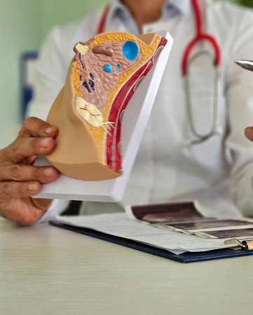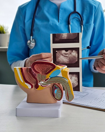 Prostate disease and treatment. Male reproductive system anatomical model in doctors hands close-up during consultation of male patient with suspected bacterial prostatitis