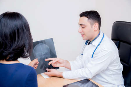 Asian man doctor holding x-ray discussing woman patient in clinic.