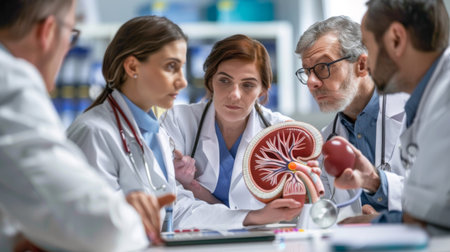 A group of medical professionals discussing a model of the human kidney