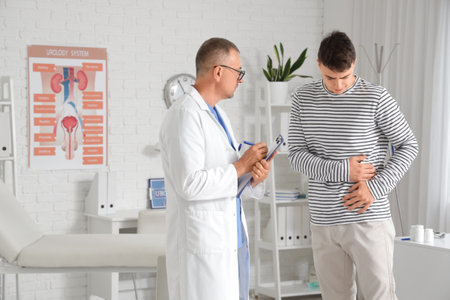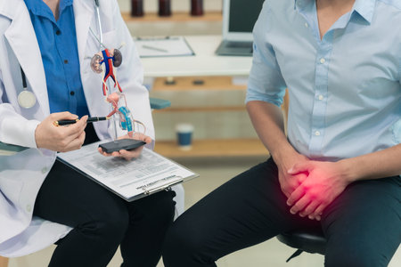 Man with prostate problem visiting urologist in clinic, closeup