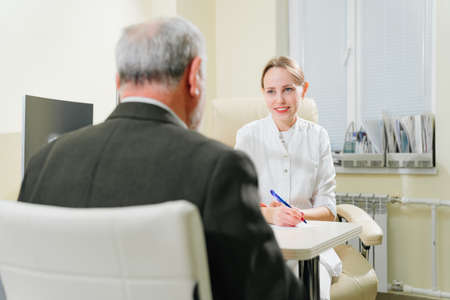 Old man answering doctor questionnaire during examination in hospital room. Converstation with medical stuff clinic medicine healthcare, senior, coat, clipboard.