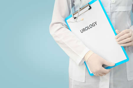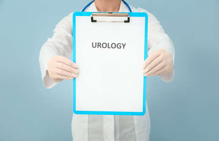 Female urologist with clipboard on color background, closeup