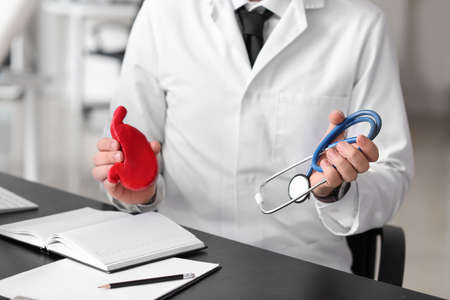 Gastroenterologist with model of stomach and stethoscope in clinic