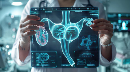 Doctor using reproductive system hologram in operating room generative ai illustration