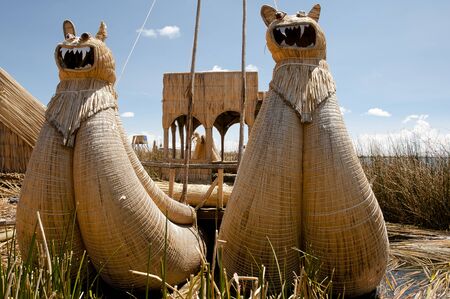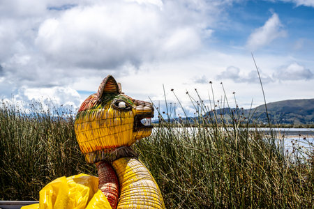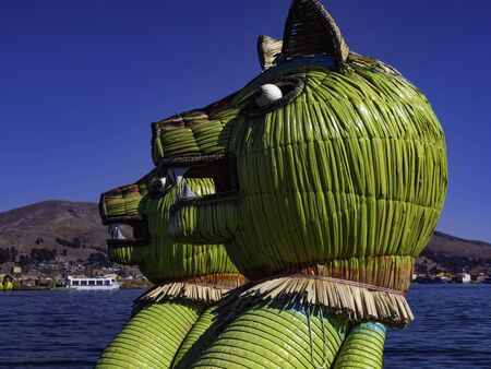 A traditional - balsa - boat with a puma-shaped prow, crafted from totora reeds, on the floating island of Uros Titino, Lake Titicaca, Peru