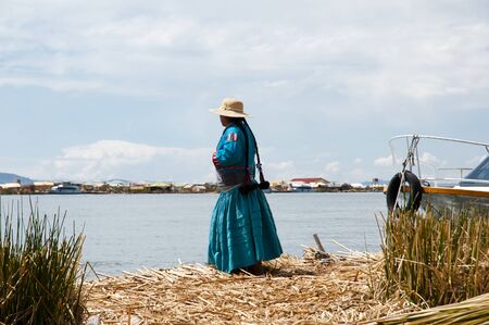 Titicaca, Peru, March 19, 2015: Woman on the boat on lake Titicaca. Traditional village on floating Uros islands. Peru, South America