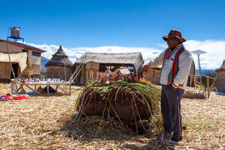 Floating islands of Uros on Lake Titicaca in Peru, South America - 2019-12-01. A man in a national costume shows his products