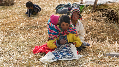People on the floating Uros Islands on Lake Titicaca in Peru.