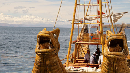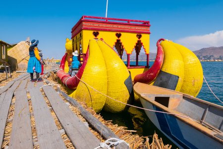 Titicaca, Peru - September 2017: Traditional reed boat as transportation for tourists, Islas es los Uros, Lake Titicaca, Peru