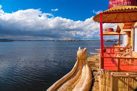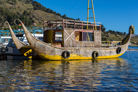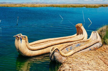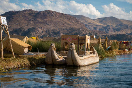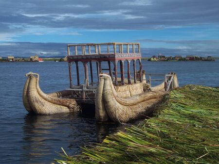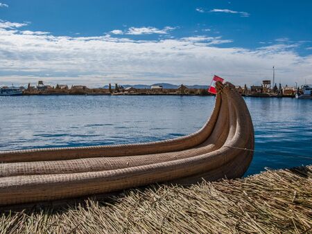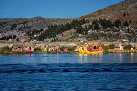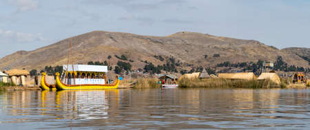 Titicaca Lake Peru, August 16 typical boat made of totora that bring tourists to visit the islands in Titicaca lake. Shoot on August 16, 2019