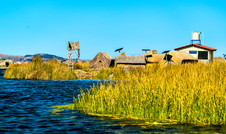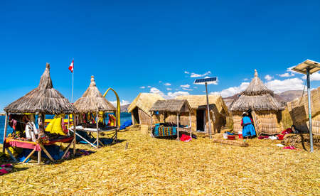 Village of the Uros Islands, entirely made of Totora Reeds, floating on Titicaca Lake, among the most interesting travel destination in Peru. Concpet of local cultures and tribal heritage.