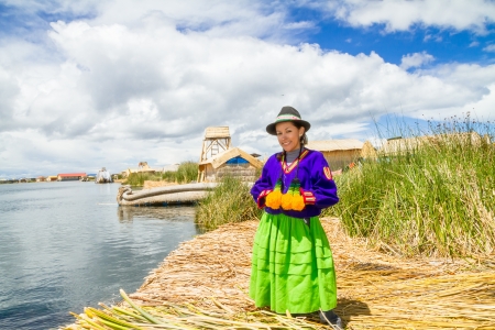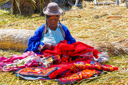 PUNO, PERU - MAY 14, 2015: Unidentified woman in traditional dress showing handicrafts in Uros Island.