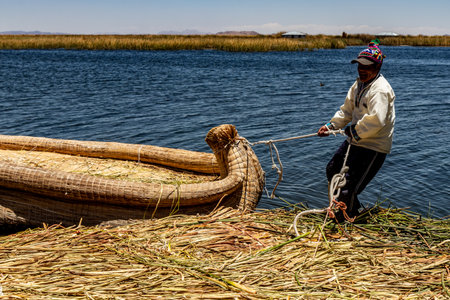 TITICACA, PERU - NOVEMBER 5, 2022: Local man with a boat made of reed on Uros floating island on Titicaca lake, Peru