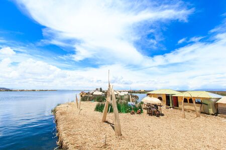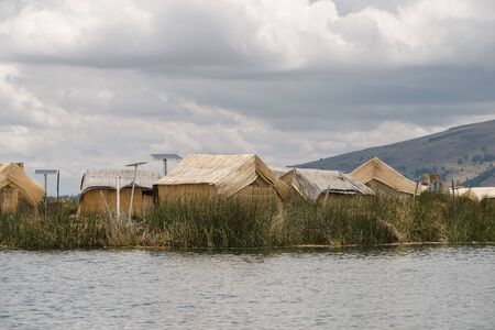 Floating Islands on Lake Titicaca Puno, Peru, South America, thatched home. Dense root that plants Khili interweave form natural layer about one to two meters thick that support islands