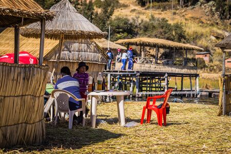 Puno, Peru - September 2017: Unidentified people at the Floating island Isla Flotante, Titicaca lake, Peru