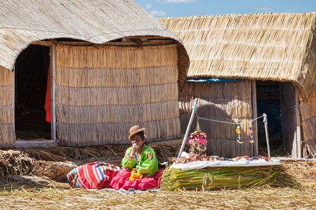 Titicaca Lake Peru, August 16 portrait of a woman in traditional clothes working on one of the islands of Uros in Titicaca lake. Shoot on August 16, 2019