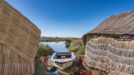 The Uros Floating Islands. Reed huts, a boat moored at the shore. Household items are scattered. Thickets of totora reeds in the water. The blue sky. Lake Titicaca. Peru