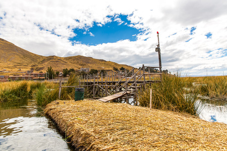 A pier made of straw and wooden planks on the floating islands of Lake Titicaca. Puno, Peru.