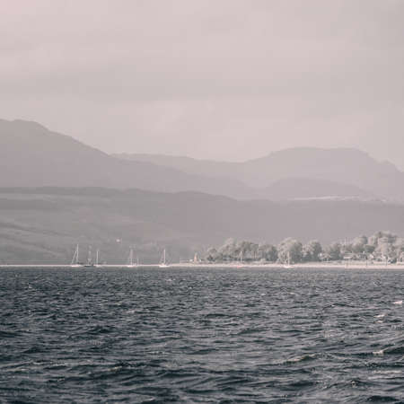 Rocky shore of the Firth of Clyde river, panoramic view from a sailing boat. Dramatic sky after the storm. Scotland, UK. Travel destinations, eco tourism, vacations, pure nature. Atmospheric landscape