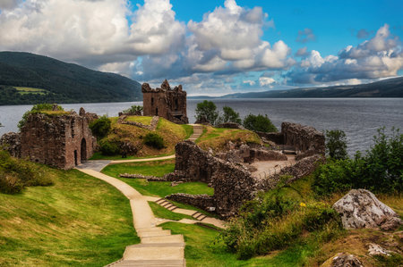 Loch Ness, Scotland - June 2, 2012: The ruins of Urquhart Castle sit on a green cliff looking over Loch Ness. Surrounding green hills. Light blue sky with white clouds.