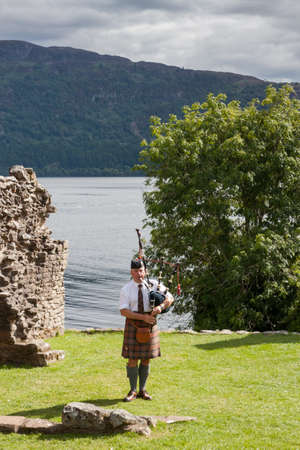 URQUHART CASTLE, UNITED KINGDOM - AUGUST 13: Scottish Highlander wearing kilt and playing Bagpipe at Urquhart Castle, on August 13, 2013. Urquhart Castle sits beside Loch Ness in the Highlands of Scotland.