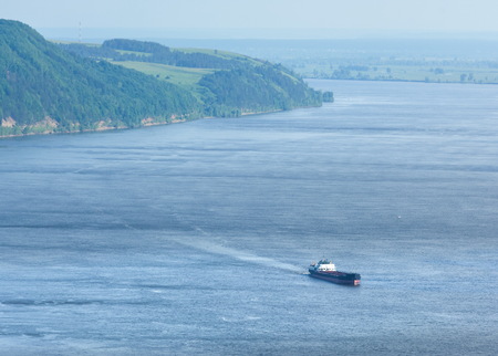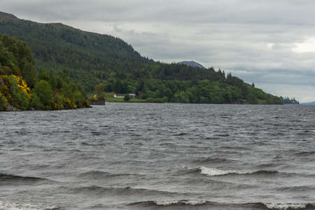View over a lake in Scotland. Loch Ness by day by boat. Houses on the shore with forest and mountains in the background in summer. Green trees on the mountain slopes