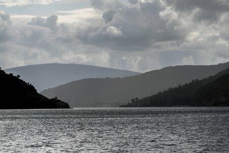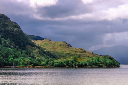 Green hills near Firth of Clyde river, panoramic view from a sailing boat. Dramatic sky after the storm. Scotland, UK. Travel destinations, eco tourism, vacations, pure nature. Atmospheric landscape
