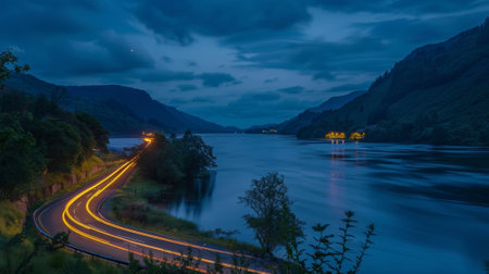 A night drive along a picturesque riverside road framed by the ling lights of passing cars