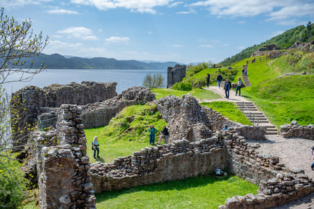 INVERNESS, SCOTLAND - AUGUST 10, 2017 - View of Urquhart Castle in Scotland with a row of visitors exploring castle ruins.