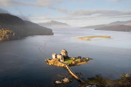 Eilean Donan castle aerial view from above at sunrise