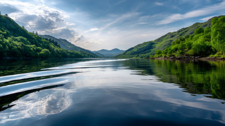 Mindfulness calm background banner of aerial view from above loch in moody sunrise sky in Scotland