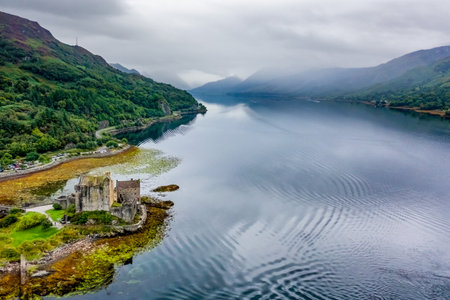 Panoramic aerial view of Eilean Donan Castle and Loch Lomond in Scotland