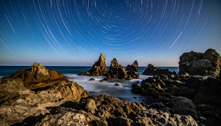 As the Earth turns, the night sky paints swirling trails of starlight above a rugged coastline.