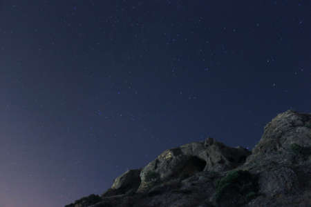 a movement of stars in the night sky with the view of mountains. . High quality photo
